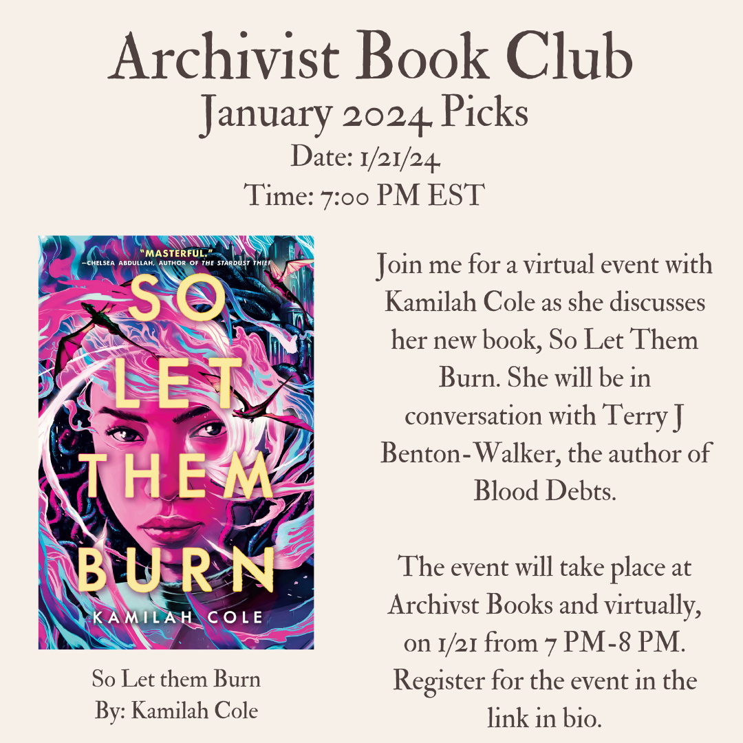 Archivist Book Club: So Let Them Burn by Kamilah Cole Sunday, January 21, 2024 7:00 PM 8:00 PM Google Calendar ICS Book Club: January 2024 Pick Join us for an author Q+A with Kamilah Cole as she sits in conversation with Terry J. Benton, author of Blood Debts. To purchase book, please click here.To register, please sign up here.